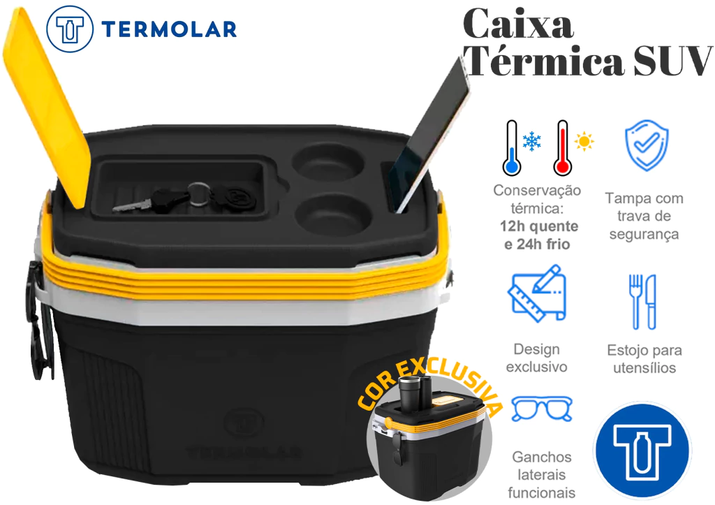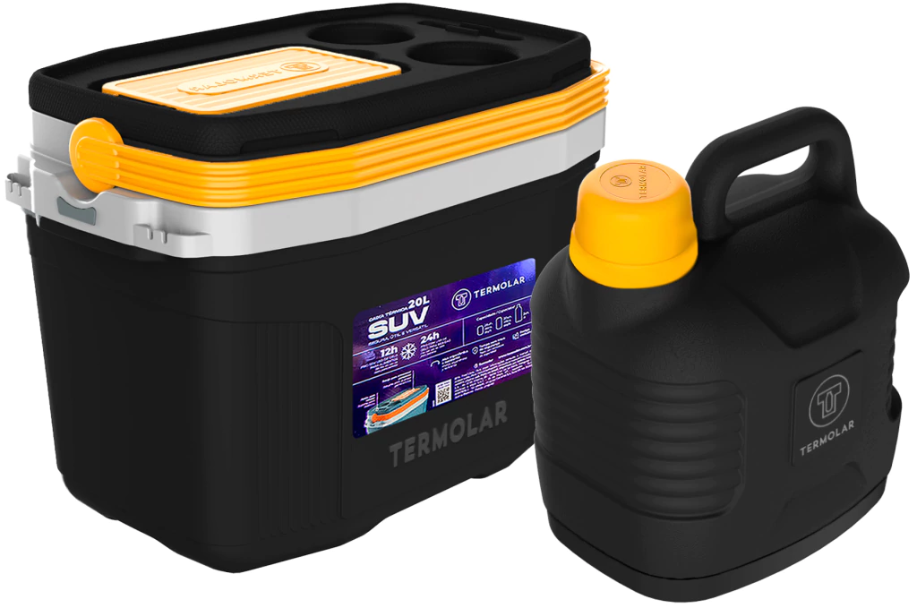Conteúdo da Embalagem: - 01 Caixa Térmica Suv Cooler Com Alça Preto e Amarelo 20l Termolar - 01 Garrafão Térmico 5 Litros Supertermo Termolar Preto e Amarelo