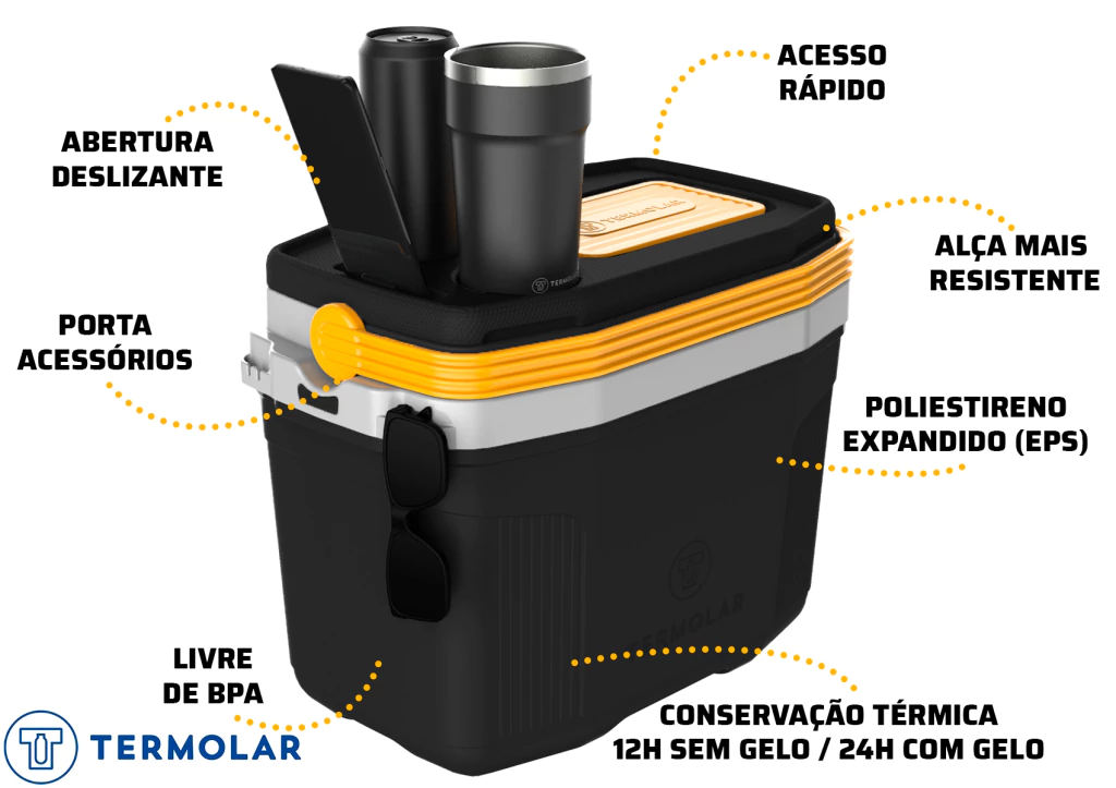 ESPECIFICAÇÕES DO PRODUTO: - Marca: Termolar; - Cor: Preto e Amarelo; - Capacidade: 20L; - Conservação Térmica: 12h sem gelo / 24h com gelo; - Dimensões do Produto: 33 cm x 26 cm x 43 cm; - Isolamento Térmico: Poliestireno Expandido (EPS); - Livre de BPA; - Material Atóxico; - Material Externo: Plástico.