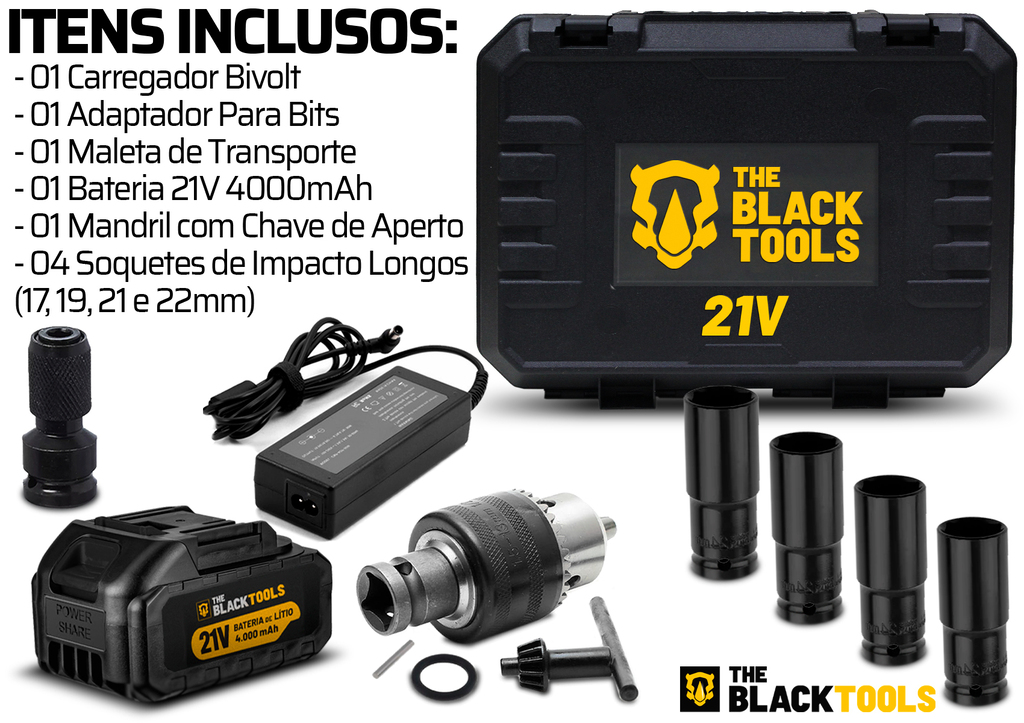 CHAVE DE IMPACTO A BATERIA 21V BIVOLT MOTOR BRUSHLESS TB-21IK The Black Tools