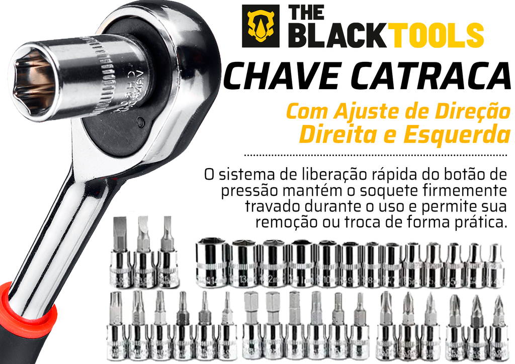 - Chave de catraca de queda rápida (ajustável positiva e negativa), o recurso de liberação rápida do botão de pressão garante que o soquete seja travado com segurança durante o uso, mas também permite fácil remoção ou troca rápida de soquete