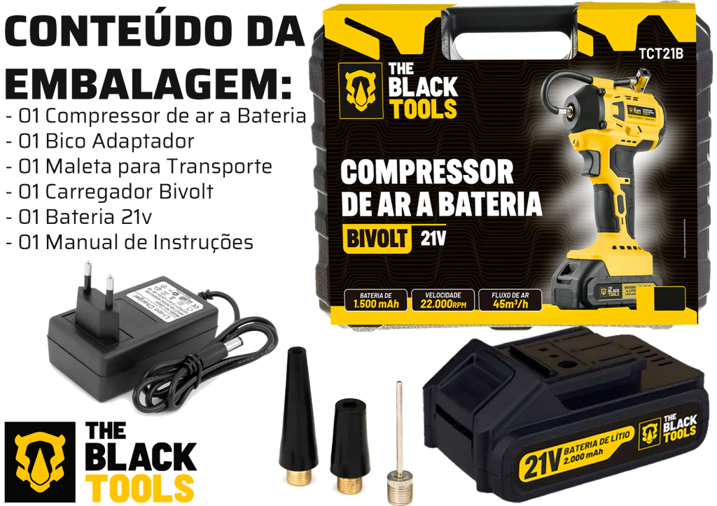 CONTEÚDO DA EMBALAGEM: - 01 Compressor de ar a bateria TCT21B The Black Tools; - 01 Maleta para transporte; - 01 Bicos adaptadores; - 01 Carregador bivolt; - 01 Bateria 21V; - 01 Manual.