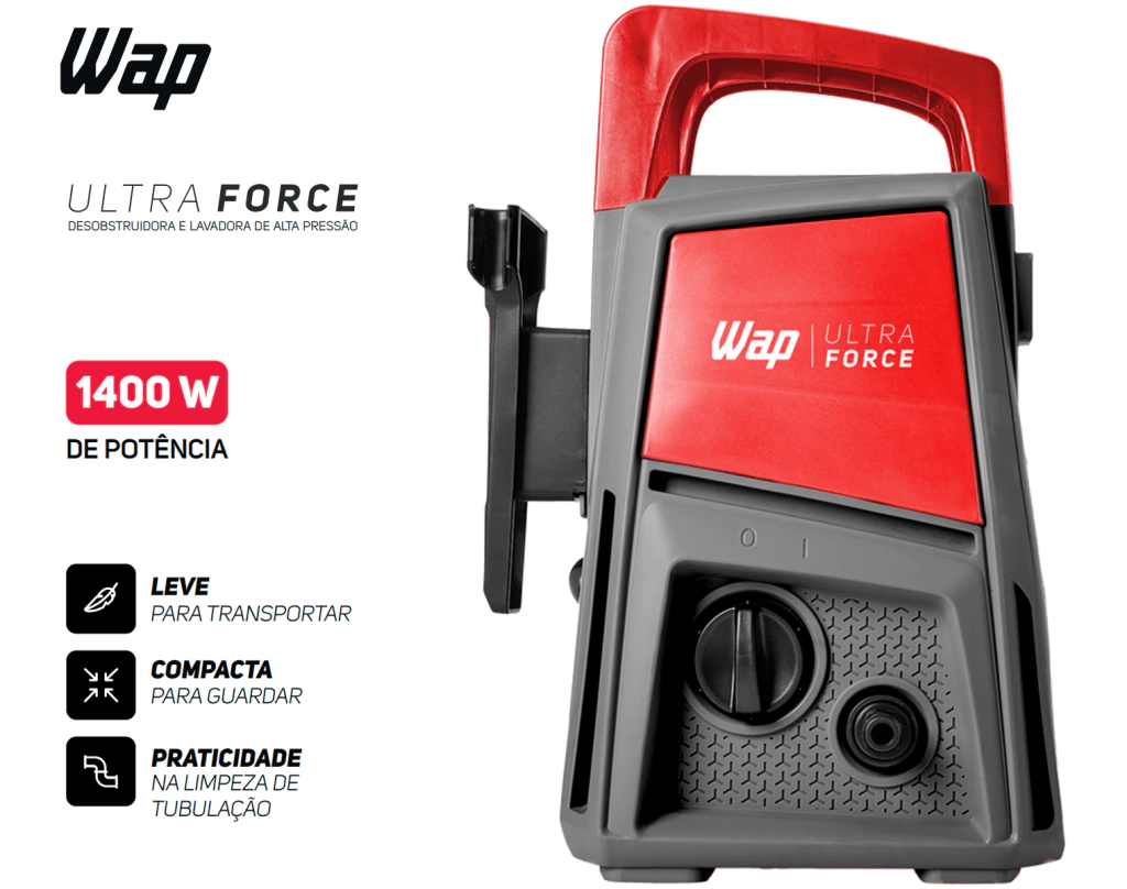 A Desobstruidora e Lavadora de Alta Pressão WAP ULTRA FORCE é um equipamento compacto de 1400W de potência, indicado para lavar calçadas, bicicletas, motos, carros e paredes com potência e agilidade, garantindo uma limpeza mais eficaz e consciente. Sua tecnologia permite economizar até 80% de água se comparada à mangueira tradicional de jardim. Além disso, com a WAP ULTRA FORCE é possível desentupir tubulações, ralos, privadas, pias de cozinha, calhas, drenos de máquinas de lavar roupas, lava-louças com facilidade, pois ela acompanha uma exclusiva Mangueira de Desobstrução por jato de água. Essa mangueira é resistente, flexível e durável, que facilita o trabalho de desentupimento, como um profissional.
