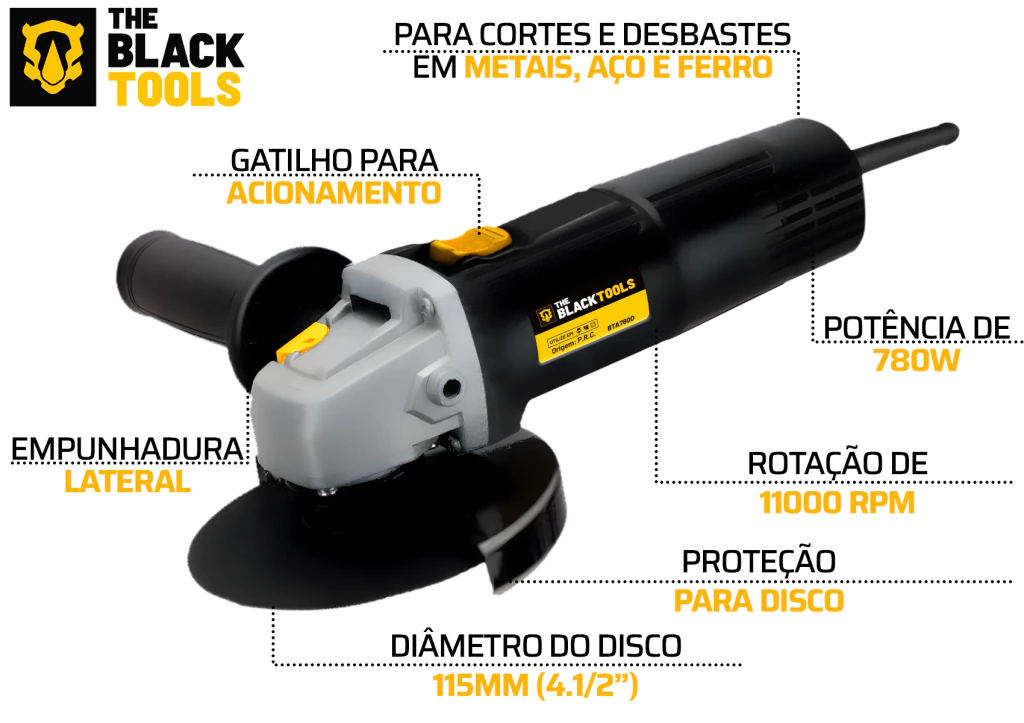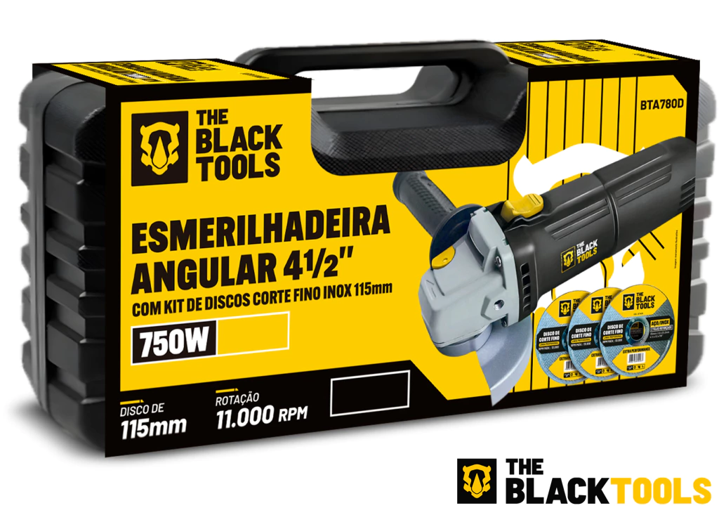 DESCRIÇÃO: A Esmerilhadeira Angular 4.1/2” BTA780D da The Black Tools é ideal para operações de esmerilhamento e corte. Projetada para desbastes em peças metálicas, acabamentos em soldas, remoção de rebarbas de peças fundidas e limpeza de superfícies enferrujadas ou pintadas. Conta com um motor potente de 750W e ótima ergonomia, incluindo punho auxiliar para maior conforto.