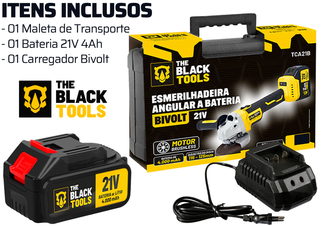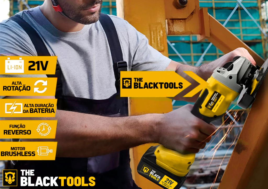 A Esmerilhadeira Angular A Bateria TCA21B da The Black Tools, é destinada para uso em operações de esmerilhamento e corte; Ideal para o desbaste em peças metálica, acabamentos sobre soldas, remoção de rebarbas de peças fundidas, limpeza de superfícies enferrujadas ou com tinta;