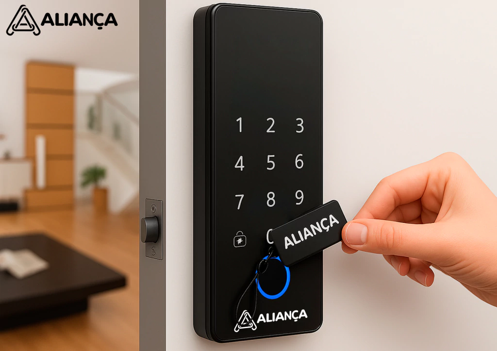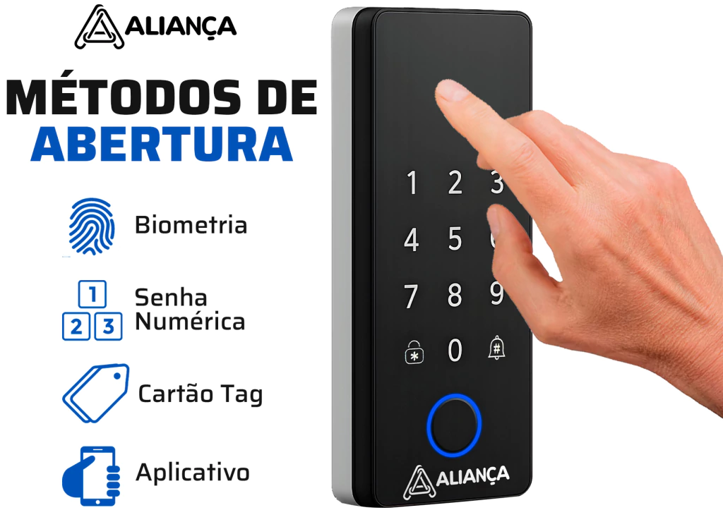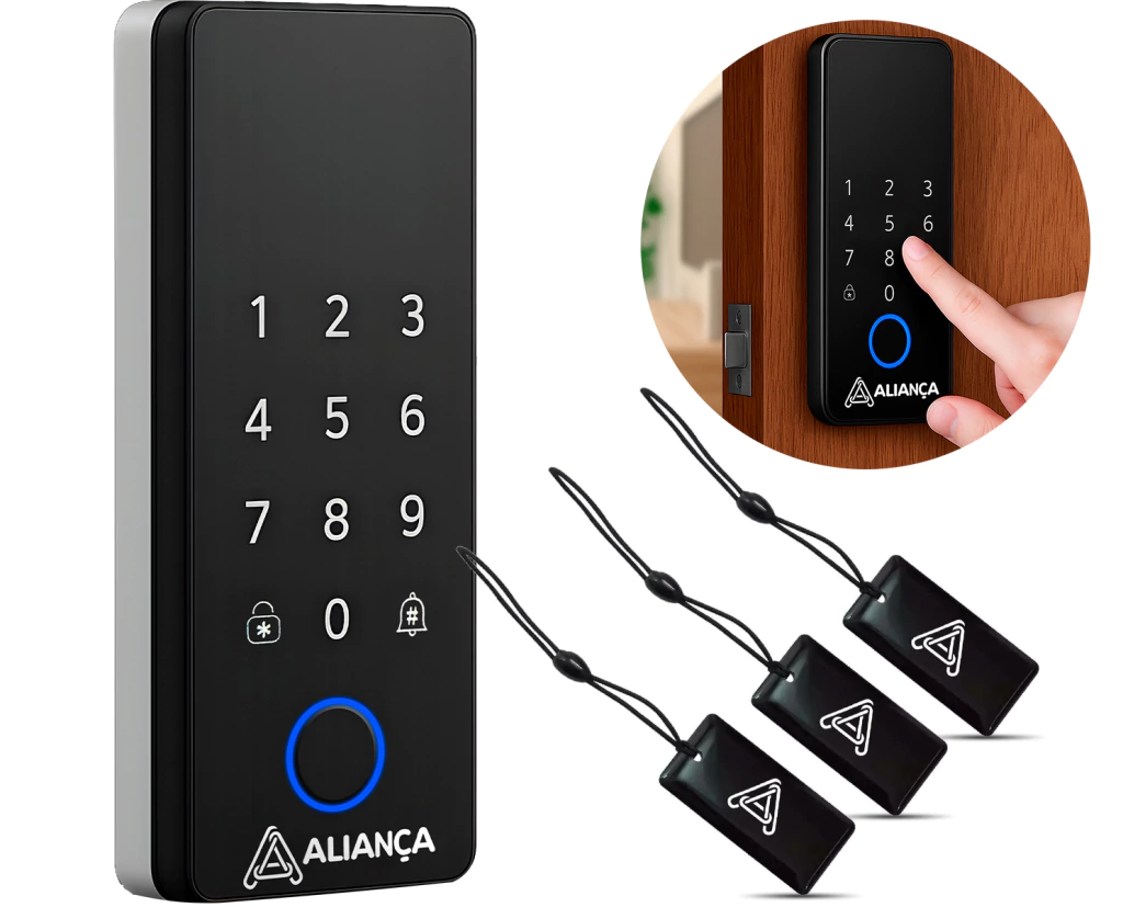 VANTAGENS: - Suporte a 4 idiomas: Português, Inglês, Espanhol e Mandarim - Instalação fácil e rápida sobreposta em portas de madeira - Acompanha kit completo para fixação e uso imediato - Conectividade TUYA-Wi-Fi para controle via app - Painel externo e interno com design sofisticado - Abertura por biometria, senha ou cartão TAG - Teclado touch moderno e resistente - Alarme de segurança integrado