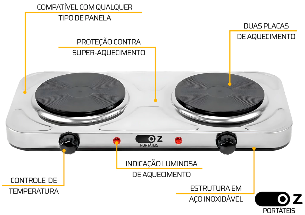 Fogão Fogareiro Cooktop Portátil Prático para Camping e Cozinha de 2 BocasO Fogão Elétrico Portátil Espiral com 2 bocas é perfeito para todas as necessidades de quem busca praticidade na hora de cozinhar, especialmente em espaços reduzidos ou em situações onde um fogão convencional não está disponível. Seu design em aço inoxidável traz um toque de sofisticação para qualquer ambiente, além de ser fácil para limpar. Conta com 2 bocas, podendo preparar dois alimentos ao mesmo tempo!Ele aceita qualquer tipo de panela que tenha na cozinha, seja de fogo, indução, barro, vidro ou qualquer outro material.Isso significa que poderá cozinhar com todas as variedades de utensílios sem preocupações. O fogareiro se adapta perfeitamente a cada tipo de panela, garantindo que possa preparar suas refeições de maneira eficiente e sem complicações.Sua operação é incrivelmente simples: basta conectá-lo a uma fonte de energia e deixar suas 5 opções de temperatura cuidarem do resto. Rápido, prático e seguro!Com duas espirais de aquecimento, equipada com um termostato de 5 níveis que variam de 80º a 400º graus, e conta com pés emborrachados, evitando contato direto com outra superfície. Este fogão é a escolha perfeita para preparar uma variedade de pratos deliciosos de forma rápida e eficiente.Características Principais:- FUNCIONA COM QUALQUER TIPO DE PANELA- Suporta até 10 Kg- Aquecimento em espiral com diâmetro de 140 mm, cada- Revestimento antiaderente que facilita a limpeza após o uso.- Termostato regulador de temperatura para um controle preciso do cozimento.- Luz indicadora de ligado/desligado para maior comodidade durante o uso.- Alcança até 400º C em menos de 1 minuto, proporcionando um aquecimento rápido.- Desliga automaticamente ao atingir a temperatura desejada, graças ao ciclo liga/desliga.- Para uso interno e externos, ideal para camping e outras atividades ao ar livre.- FUNCIONA COM QUALQUER TIPO DE PANELAEspecificações:- Tensão: 110V; ou 220V (NÃO É BIVOLT, SELECIONAR NO ATO DA COMPRA)- Potência: 2000W- Frequência: 60Hz- Material: Aço Inoxidável- Proteção: IPX0- Plug: 10 amperes com aterramento- Medidas: C:42,5 x L:24 x A:5,5 cmItens Inclusos:- 1 Fogão Elétrico Portátil com 2 Bocas- 1 Manual em Português - 1 Certificado de garantia