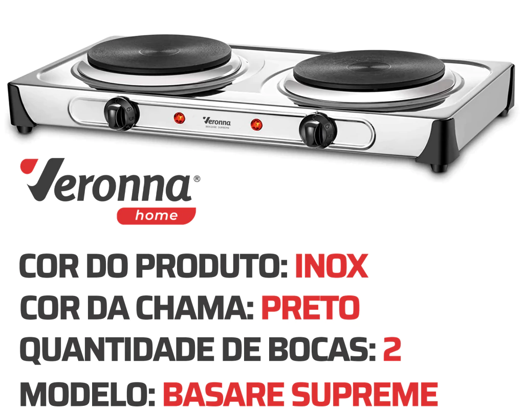 VANTAGENS: - Com o fogão elétrico da Veronna você prepara carnes, massas, legumes, sopas e muito mais; - Chapa com aquecimento rápido e sem utilização de gás; - Garante precisão e eficiência na hora do preparo; - Compatível com todos os tipos de panelas.