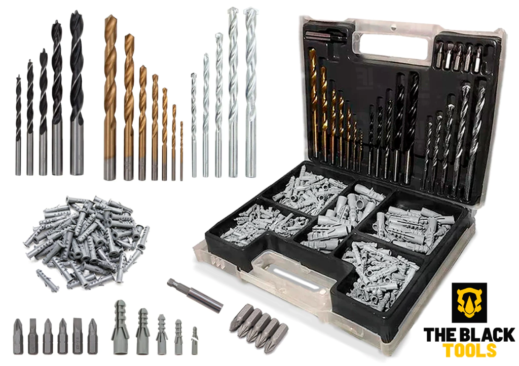 O Jogo de brocas bits e buchas com 300 peças The Black Tools MTX é ideal para uso doméstico e hobby, conta com as brocas e bits e buchas com as medidas mais comuns. As Broca de concreto são feita de aço carbono com uma placa de metal duro feita de material VK8, brocas para metal de aço rápido (HSS), brocas para madeira são de aço-carbono. Bits de aço cromo vanádio, instrumentos embalados em caixa de plástico.
