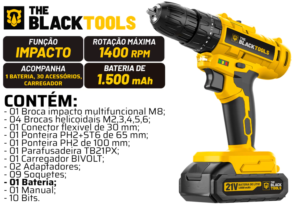 .Distribuído por Ismafer Ferramentas FURADEIRA PARAFUSADEIRA DE IMPACTO SEM FIO A BATERIA 21V 3/8 10MM COM MALETA E ACESSÓRIOS TB-21PZW - The Black Tools