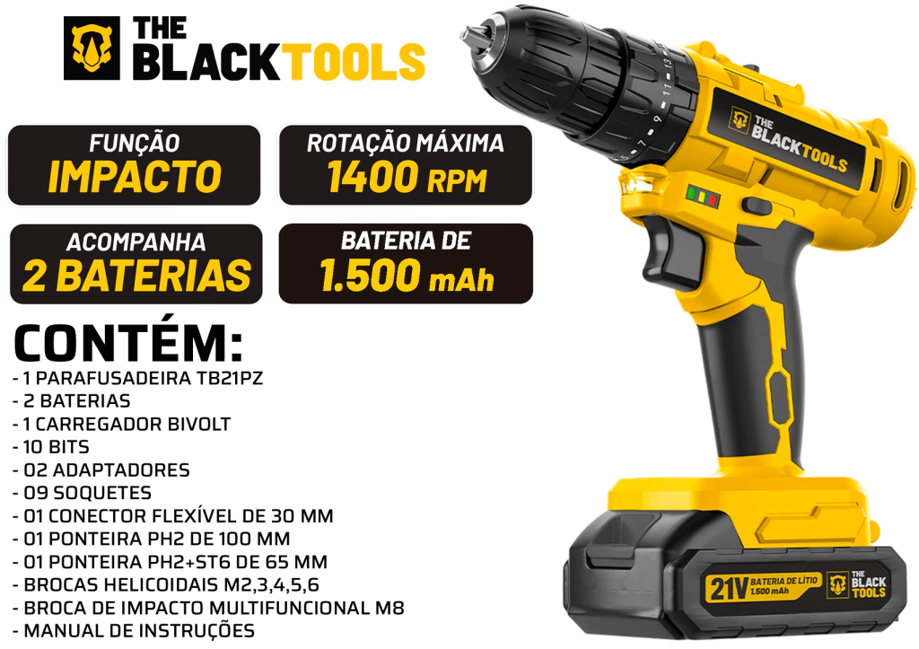 FURADEIRA PARAFUSADEIRA DE IMPACTO SEM FIO A BATERIA 21V 3/8 10MM COM MALETA E ACESSÓRIOS TB-21PZ - THE BLACK TOOLS