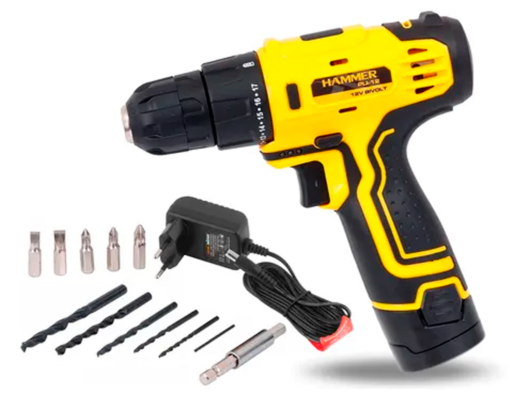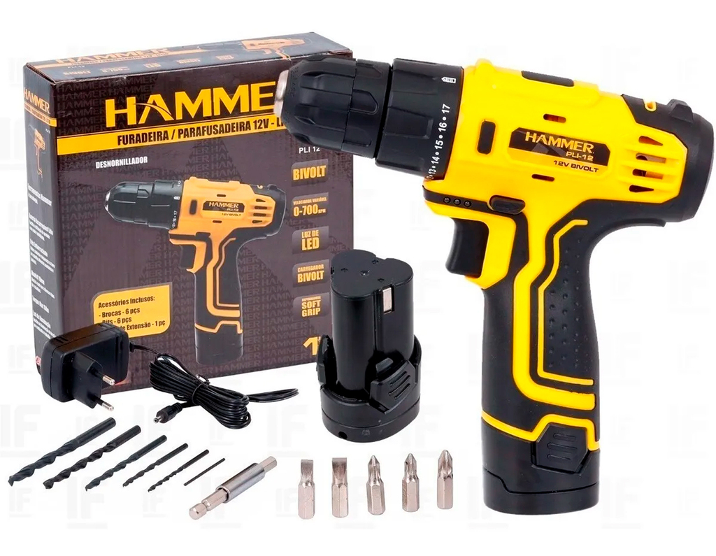 Garanta a Furadeira e Parafusadeira 3/8" 12V GYPLI12 Bivolt Hammer e tenha a solução ideal para pequenos reparos e manutenções em geral. Bateria: Praticidade, você conseguirá realizar trabalhos em locais que não tenham tomadas por perto ou seja necessário uso de extensões. Controle de Torque: É um sistema que controla o quanto de força a sua parafusadeira vai exercer sobre o parafuso, impedindo que você enterre o parafuso no material que está sendo trabalhado, deixando um melhor acabamento. Velocidade variável: Tem velocidade variável reversível, garantindo mais controle ao manusear a ferramenta e mais qualidade no acabamento da peça! Conteúdo da Embalagem: Acompanha parafusadeira, 1 bateria 12V, 13 acessórios, manual de instruções.