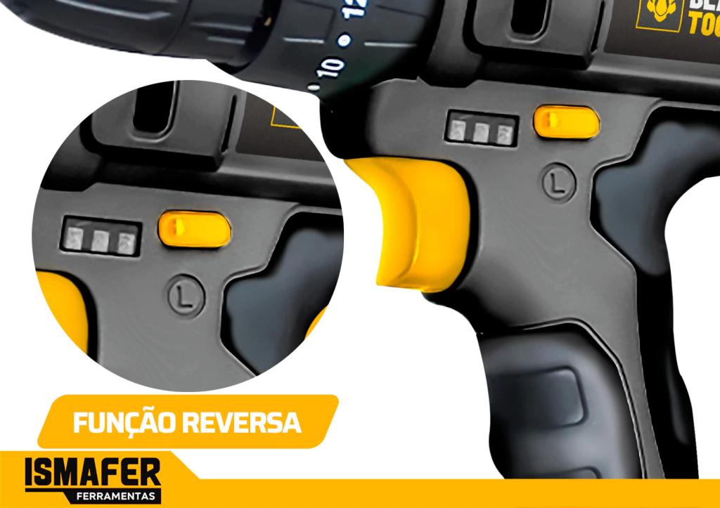 FICHA TÉCNICA: - Diâmetro do mandril 3/8” 10mm (aperto rápido). - Rotação sem carga : 0-400 / 0-1400 RPM. - Velocidade variável e reversível . - Indicador de carga de bateria . - Empunhadura Soft Grip. - Opção de torque 18 + 3. - Bateria de 2000 mah. - Torque Max 35 N.M. - Voltagem: Bivolt