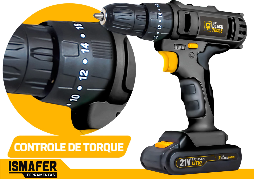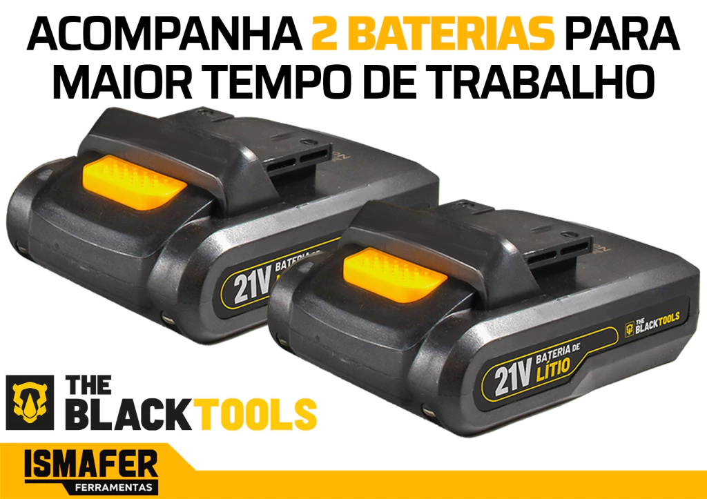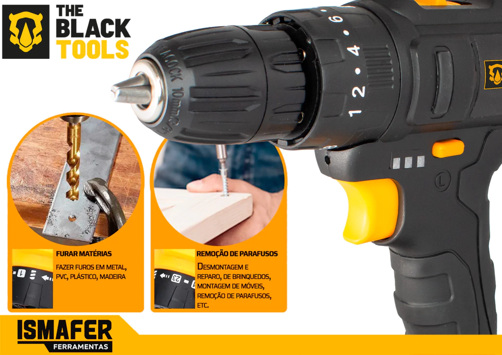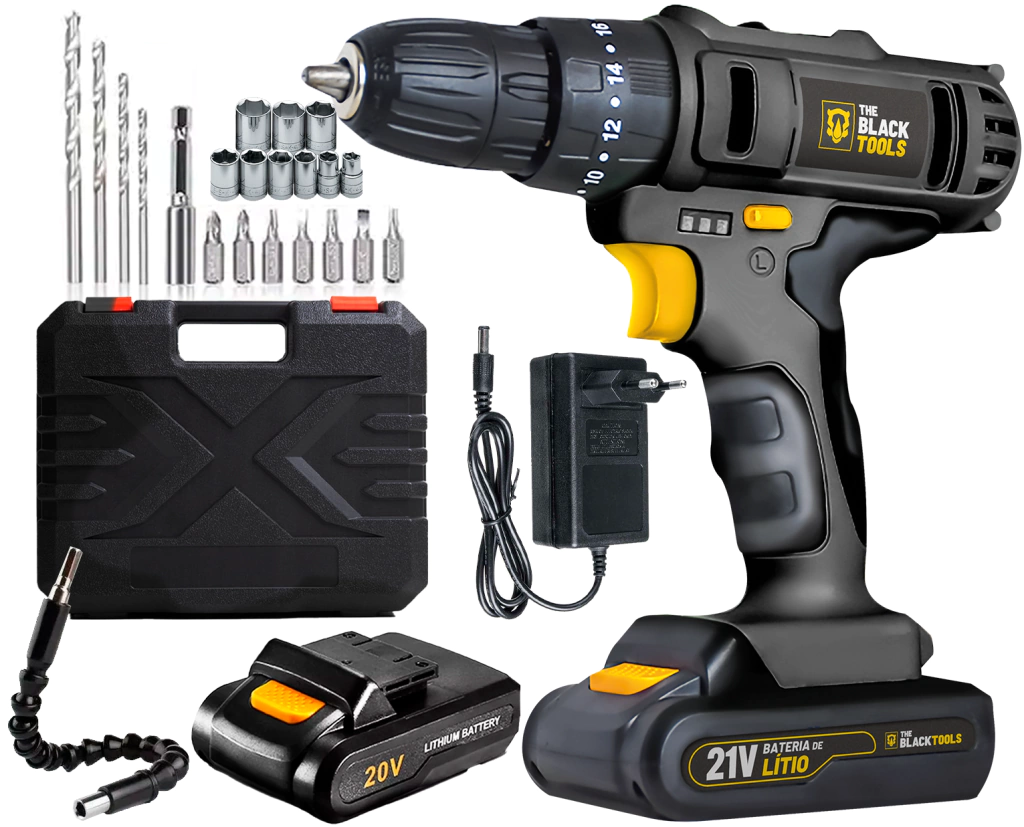 FURADEIRA PARAFUSADEIRA DE IMPACTO SEM FIO A BATERIA 21V 3/8 10MM COM MALETA E ACESSÓRIOS - The Black Tools