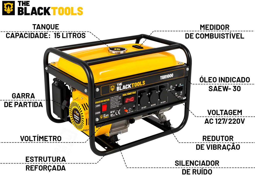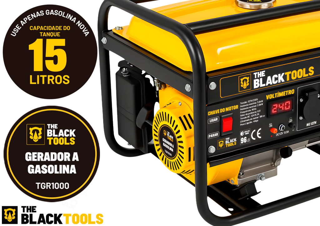 O Gerador de Energia TRG1000 da The Black Tools é a escolha ideal para quem busca autonomia e segurança no fornecimento de energia elétrica em ocasiões como acampamentos, pescarias, residências ou em situações emergenciais. Seu motor potente de 196cc e a tecnologia AVR (Regulador Automático de Tensão) garantem desempenho confiável e proteção para seus equipamentos eletrônicos mais sensíveis.