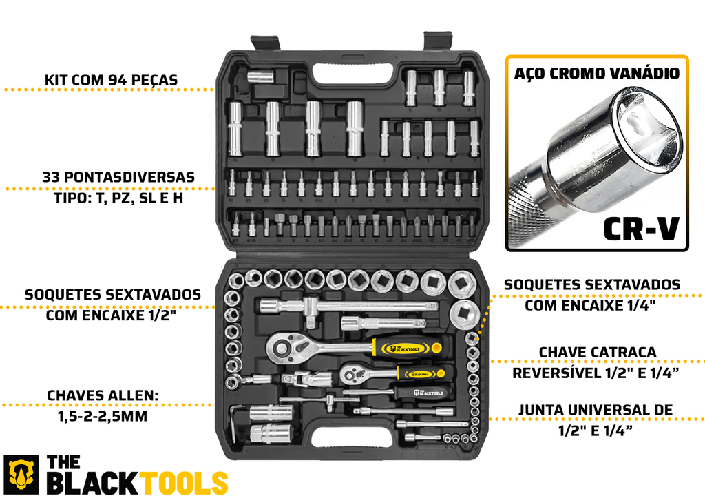 ESPECIFICAÇÕES: - Material: Aço cromo-vanádio (Cr-V) - Acabamento: Cromado - Número de peças: 94 - Encaixe: 1/4" e 1/2"