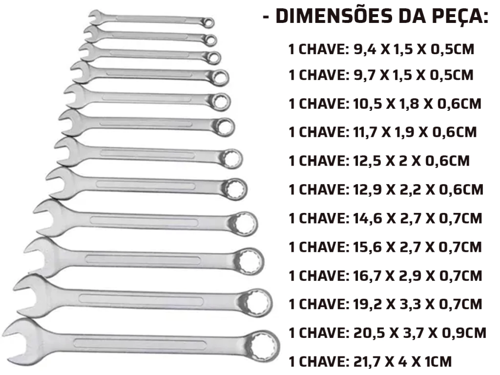 Este jogo de chaves combinado com 12 peças é a solução ideal para os que buscam ferramentas de alta qualidade e durabilidade. Fabricadas em aço de alta qualidade, essas chaves oferecem resistência à corrosão e ao desgaste, garantindo uma longa vida útil com ótimo desempenho. O jogo de chave combinada de 6 a 22mm é composto por com 12 peças. Ideal para mecânicos, técnicos de manutenção, instaladores e entusiastas de reparos em geral.
