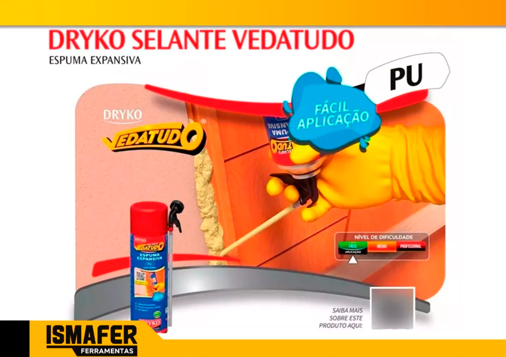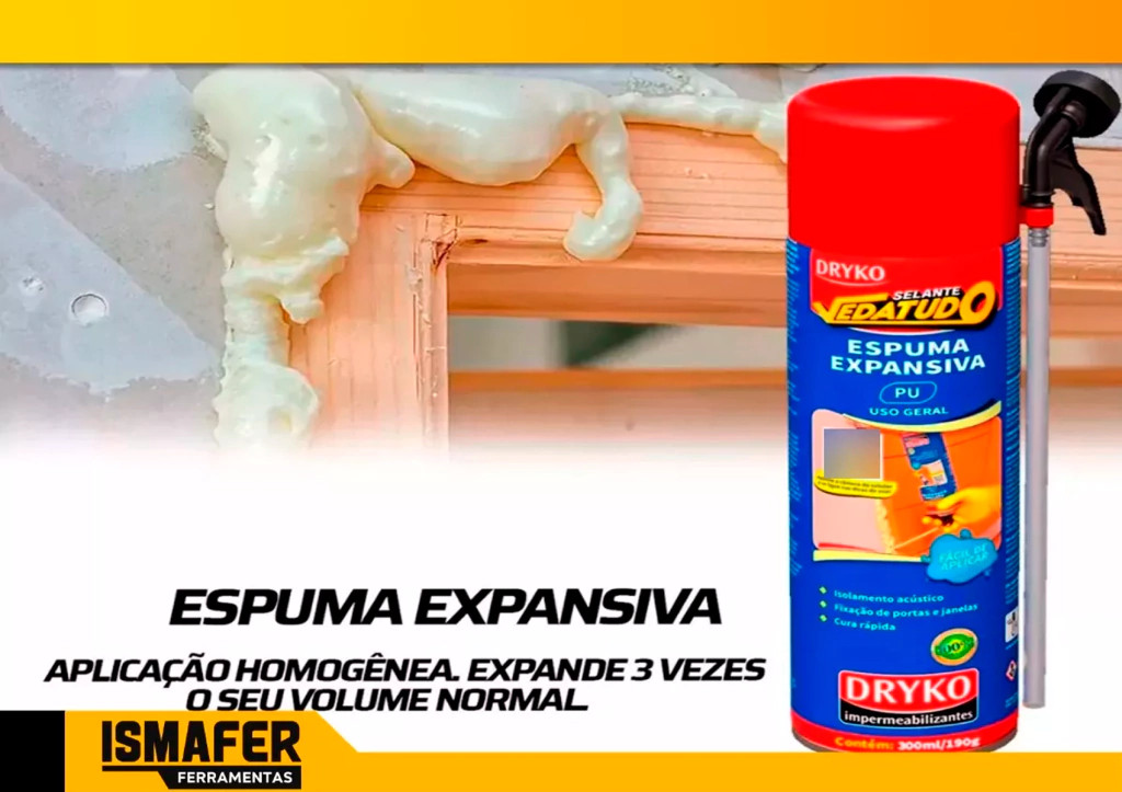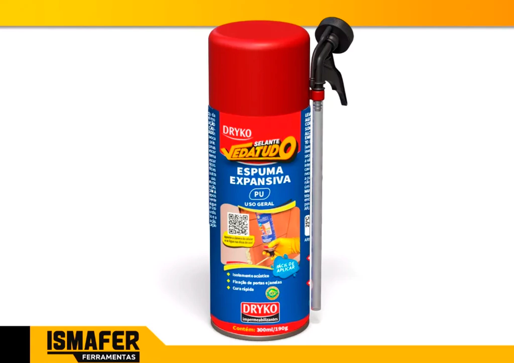 Espuma expansiva de poliuretano, monocomponente, que reage com a umidade do ar tornando-se, após a cura, em uma espuma rígida, atóxica e com propriedades de fixação, adesão, isolamento e enchimento.