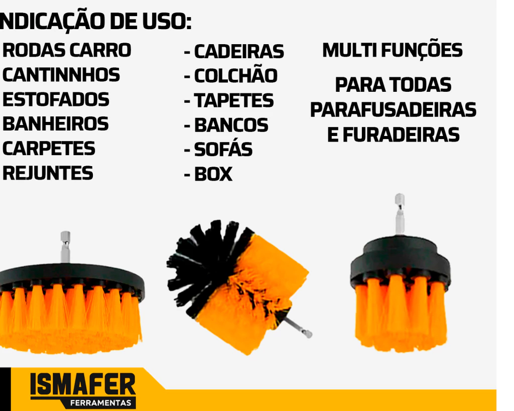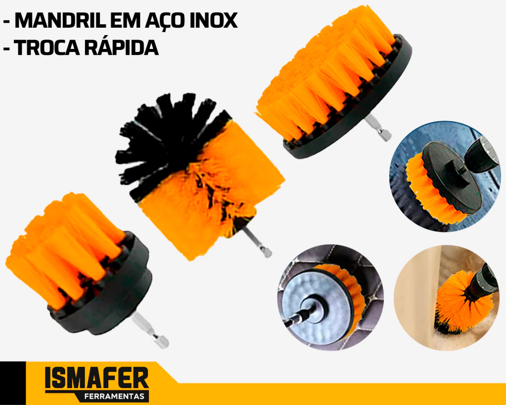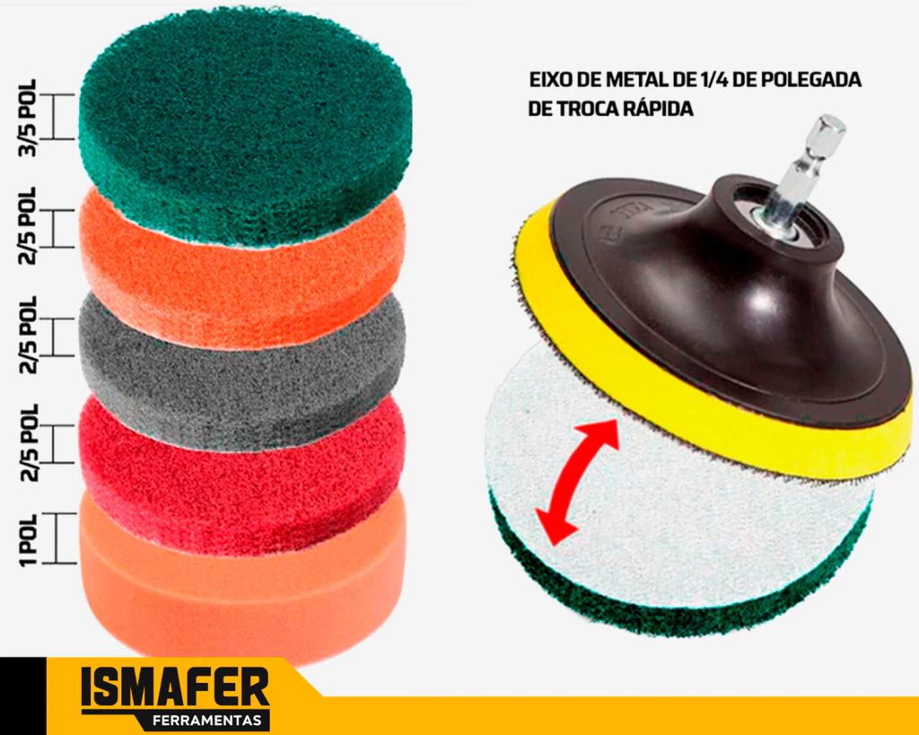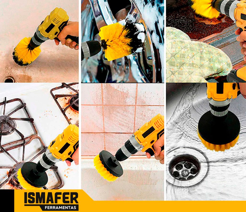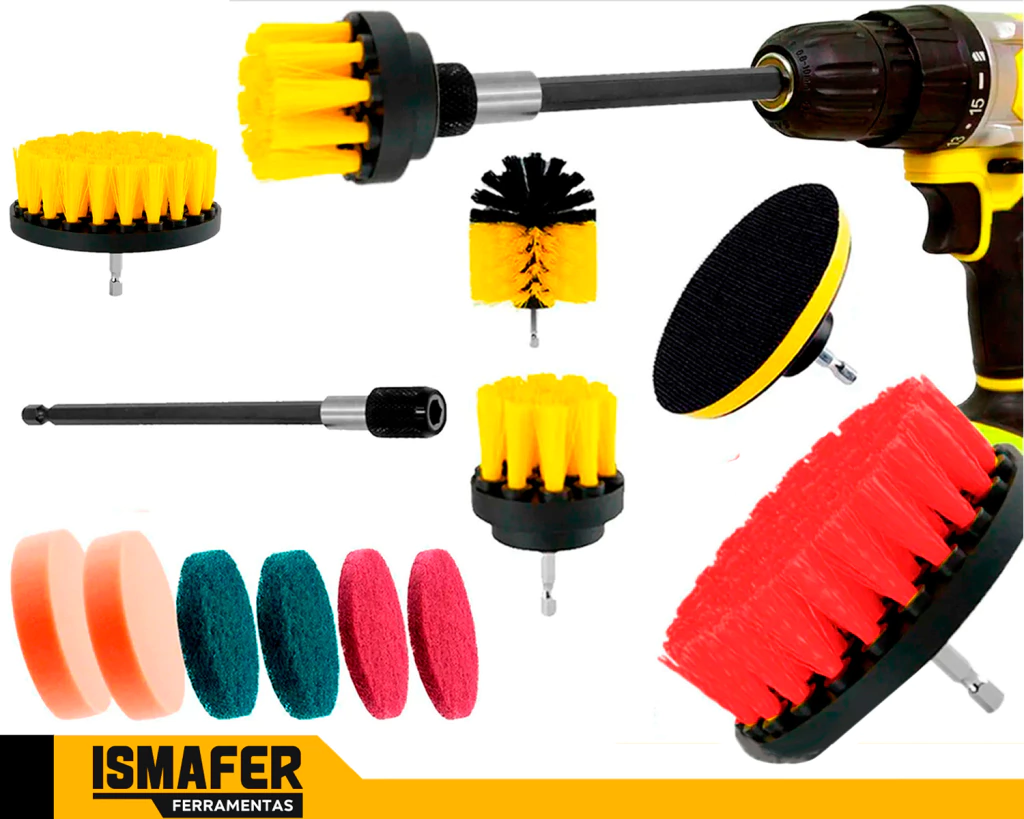 ITENS INCLUSOS: - 04 Escovas rotativas (5", 4", 3,5", 2"); - 01 Base para Esfregão/Esponja; - 01 Extensor de 150mm; - 06 Esfregões de 5"; - 02 Esponjas de 5".