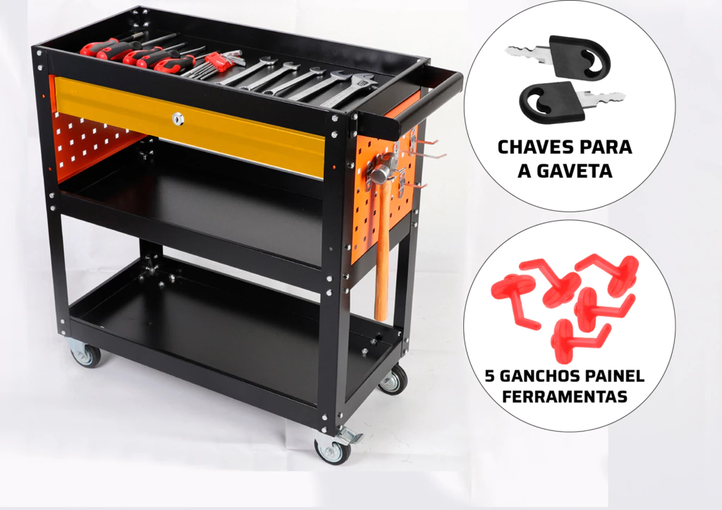 - Design Ergonômico: Este carrinho apresenta um design ergonômico que facilita o acesso às suas ferramentas. Além disso, possui uma gaveta espaçosa para guardar itens de valor e pequenas peças organizadamente.