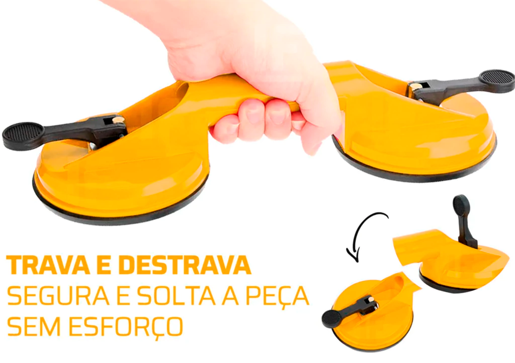 A ventosa dupla é projetada para chapas de vidros e metais, permite transferir e instalar vidros de janelas e vidros duplos, o seu corpo é feito de plástico solido para vidros de até aproximadamente 80 Kg.