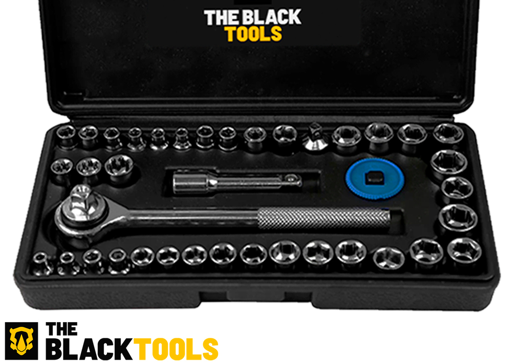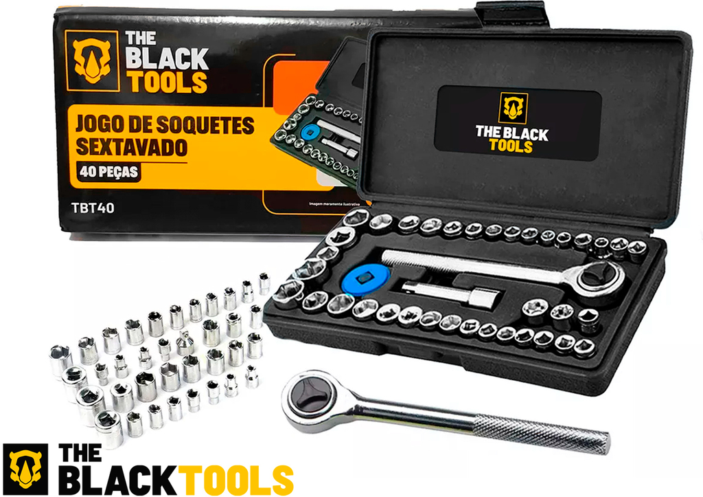 O Kit Jogo Soquete The Black Tools TBT40P com catraca 40 peças, é uma ferramenta essencial para quem busca praticidade e eficiência em reparos e manutenções;