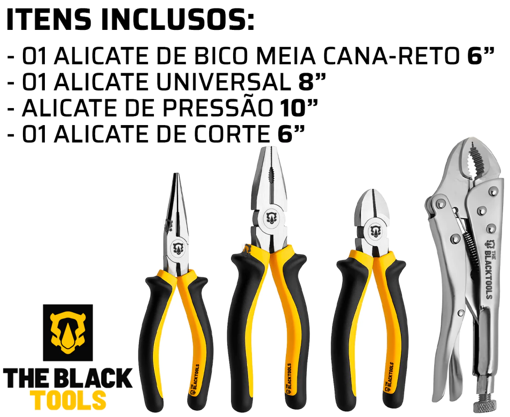 KIT JOGO DE ALICATES UTILIDADES VARIADAS UNIVERSAL CORTE BICO E PRESSÃO BKA400 The Black Tools