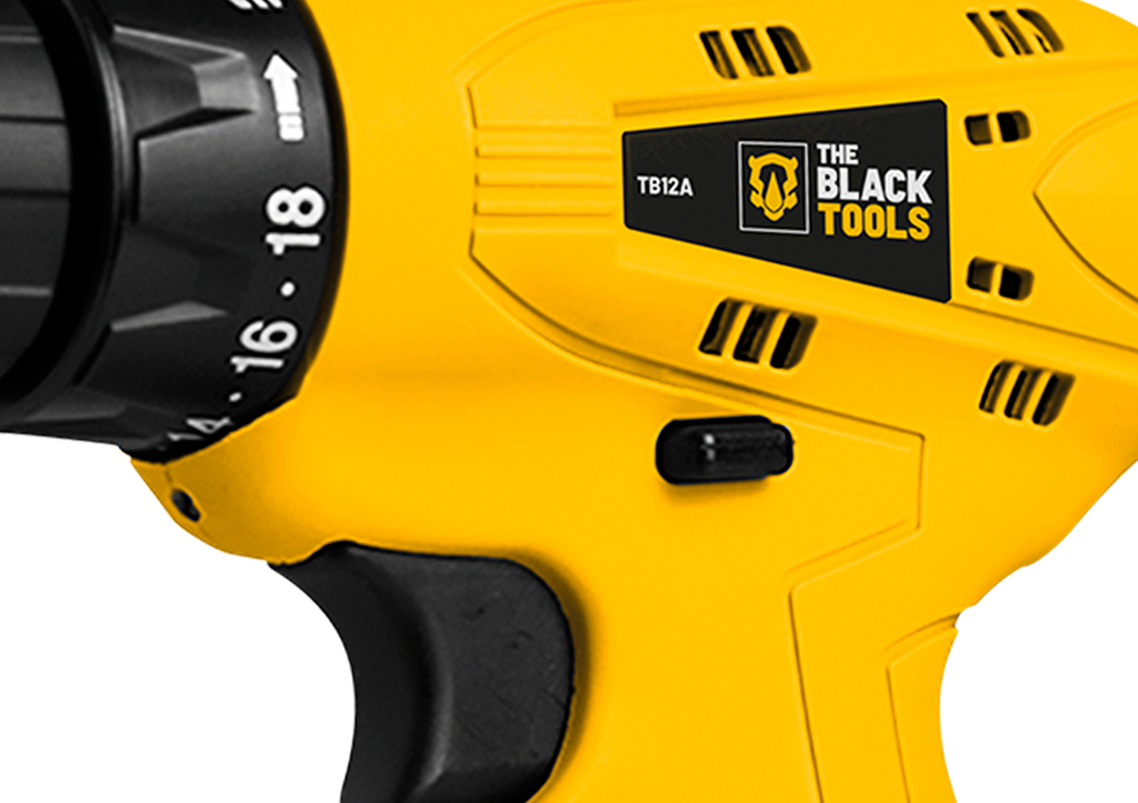 A Parafusadeira/Furadeira The Black Tools TB12A tem design ergonômico, mandril de 3/8" e luz de LED para iluminação, ideal para alcançar cantos menores e com pouca luz.