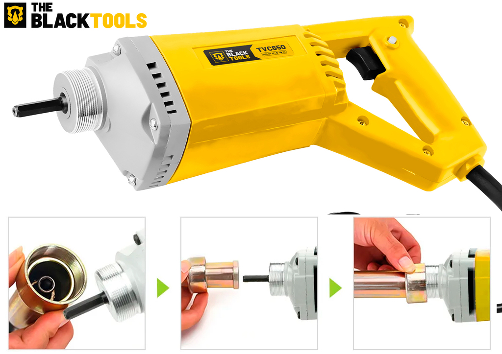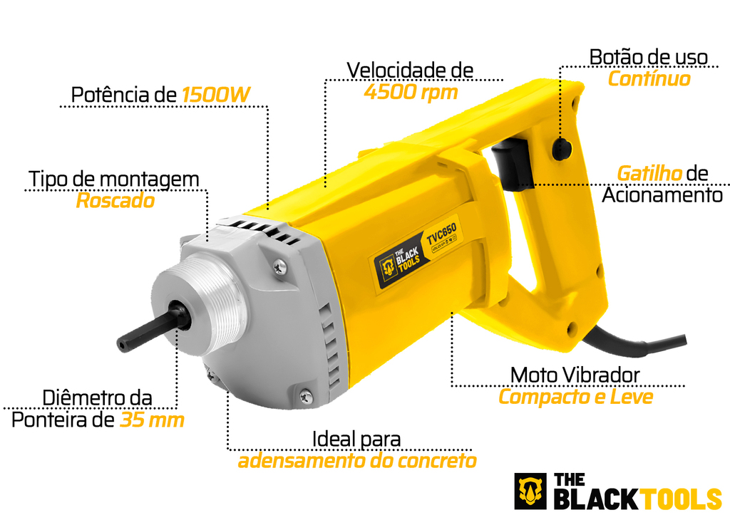 DESCRIÇÃO: O Vibrador de Concreto Portátil TVC650 da The Black Tools é um equipamento leve e eficiente, projetado para proporcionar melhor ergonomia e portabilidade aos operadores. Ele elimina espaços vazios no concreto fresco, evitando infiltrações e garantindo um acabamento de excelente qualidade e durabilidade. O mangote transmite o movimento a um elemento excêntrico dentro da ponteira, gerando a vibração necessária para compactar o concreto de maneira uniforme.