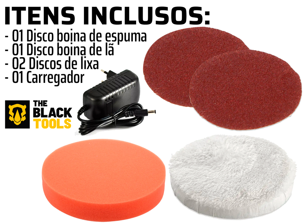 ITENS INCLUSOS: - 01 Disco boina de espuma - 01 Disco boina de lã - 02 Discos de lixa - 01 Carregador - 01 Bateria