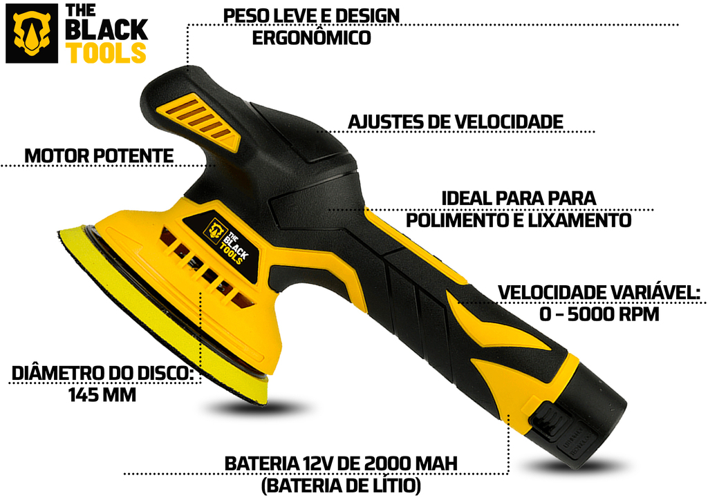 LIXADEIRA POLITRIZ ROTO ORBITAL A BATERIA SEM FIO 5000 RPM BIVOLT 12V 145 MM C/ ACESSÓRIOS BLP120 - The Black Tools