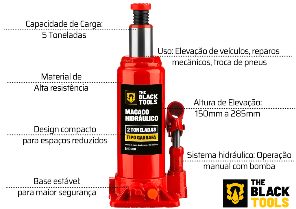 MACACO HIDRAULICO GARRAFA 2 TONELADAS 15CM A 28,50CM BHG200 - The Black Tools