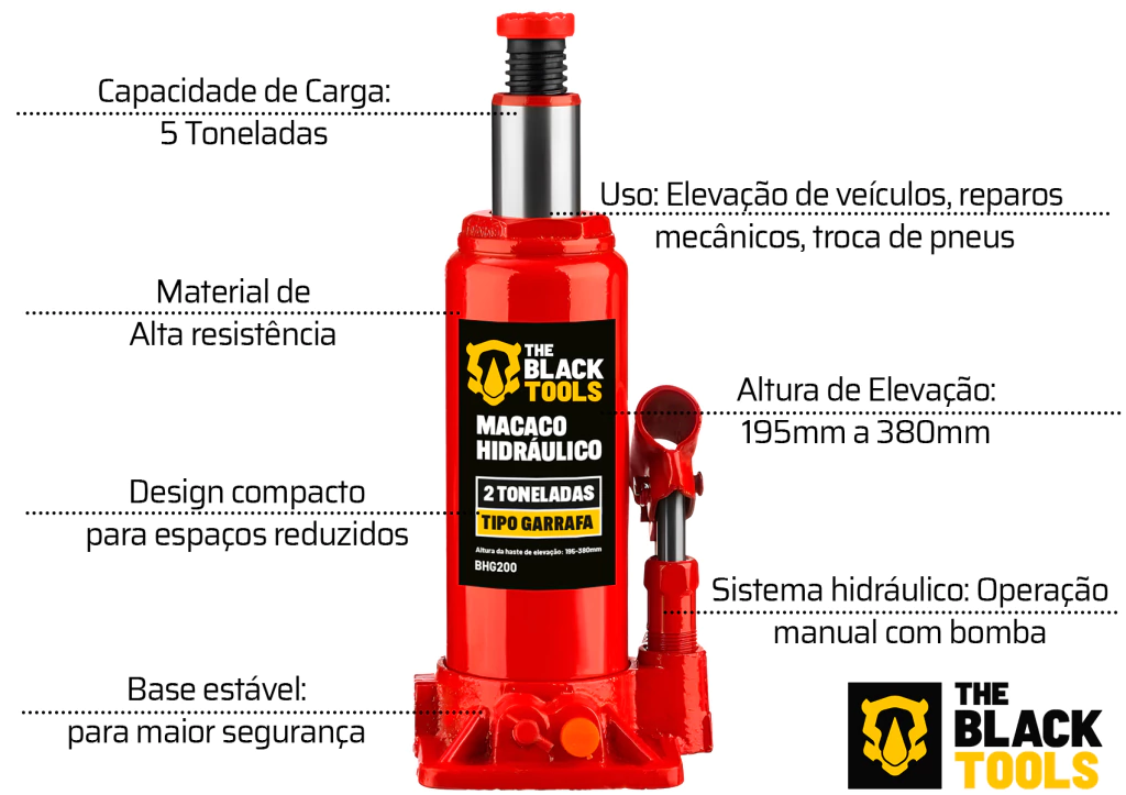 MACACO HIDRAULICO GARRAFA 2 TONELADAS 15CM A 28,50CM BHG200 - The Black Tools