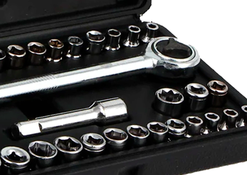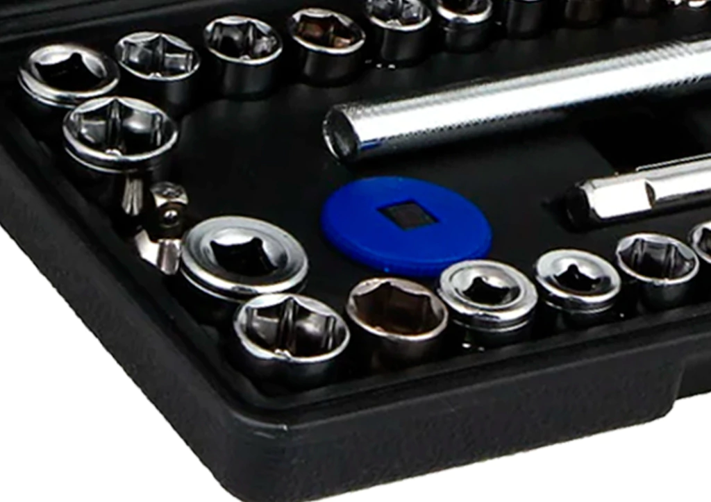Composto por 40 peças, incluindo soquetes de diversos tamanhos e uma catraca, é ideal para trabalhos em mecânica, elétrica e hidráulica.