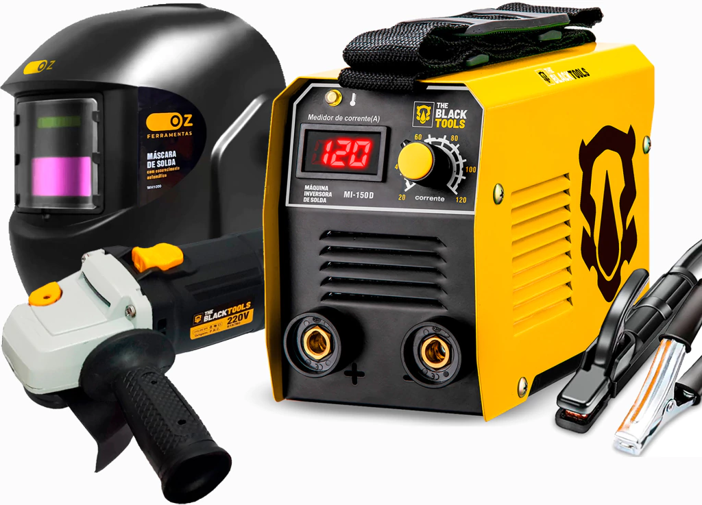 Composto por: - 1Un Máquina Inversora de Solda 120A - MI150D The Black Tools - 1Un ESMERILHADEIRA ANGULAR 4.1/2" BTA780 - The Black Tools - 1Un Mascará de solda Soldador C/ Escurecimento Automático WH1000