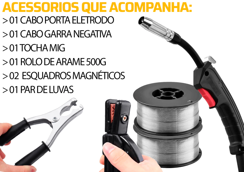 > Essa máquina utiliza arames de 1kg sem gás, regulador de corrente e velocidade de arame.