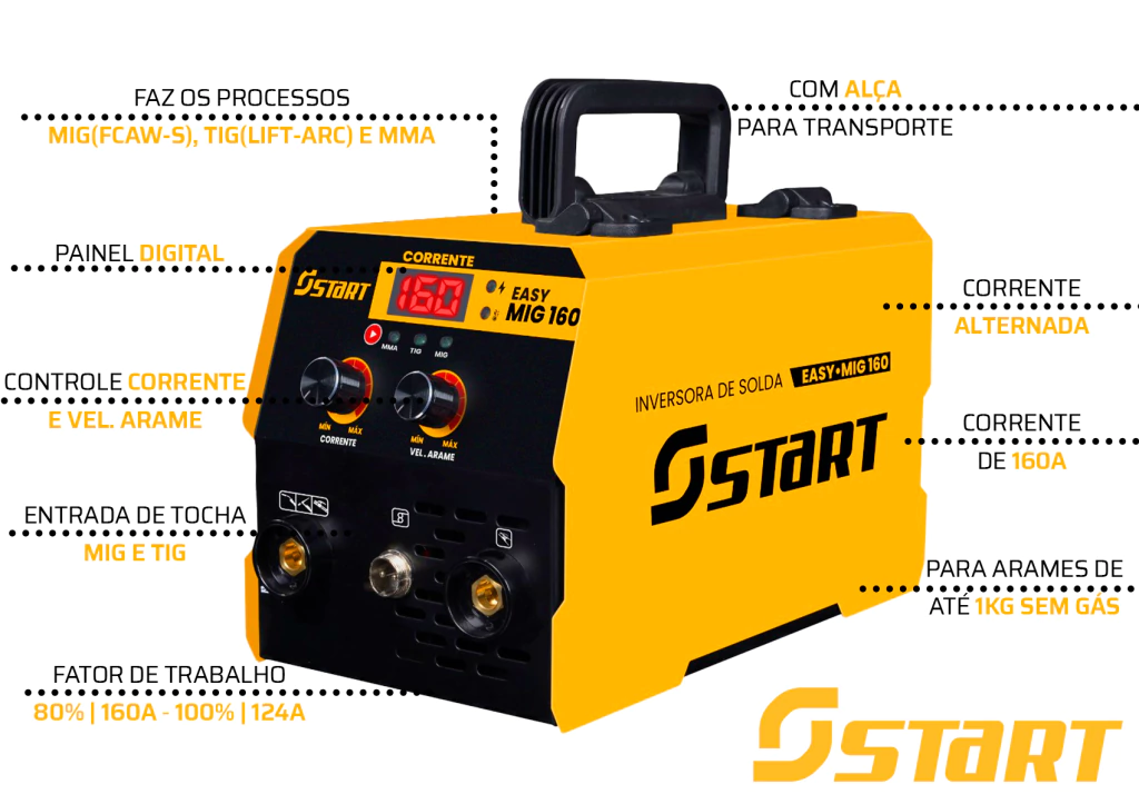 > A máquina de solda Easy MIG 160 é voltada para trabalhos pequenos e médios. Indicado para oficinas, funilarias, serralherias, pequenas indústrias, soldadores entusiastas, onde precisa de soldagem TIG, MIG e MMA.