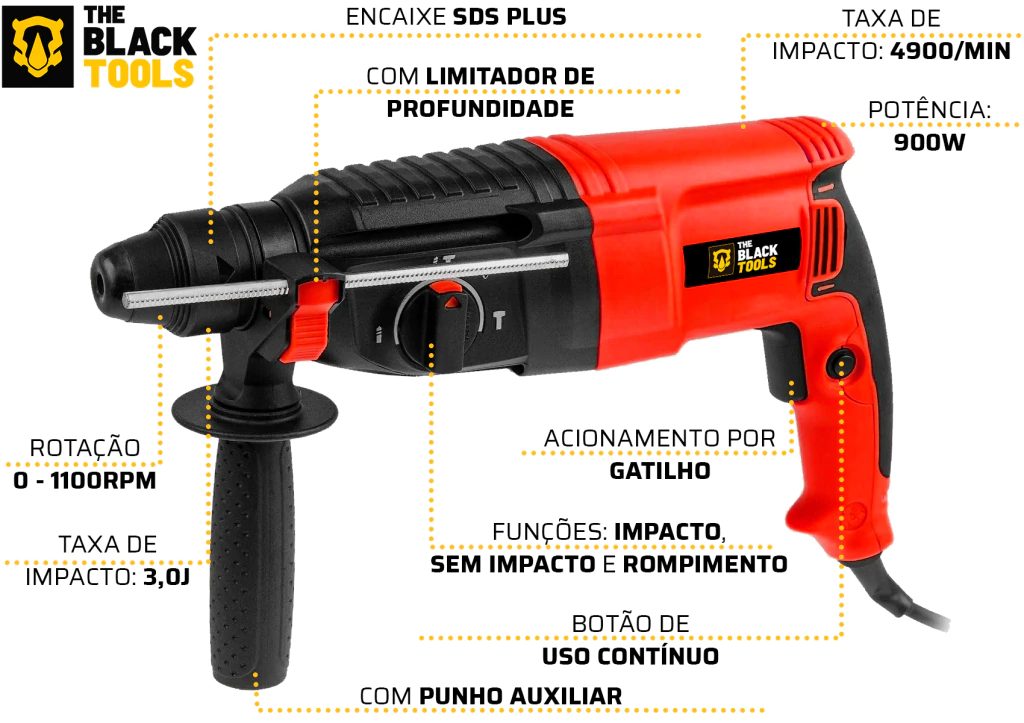 - Motor de 900 W de potência, 100% rolamentado, com até 4900 impactos por minuto;