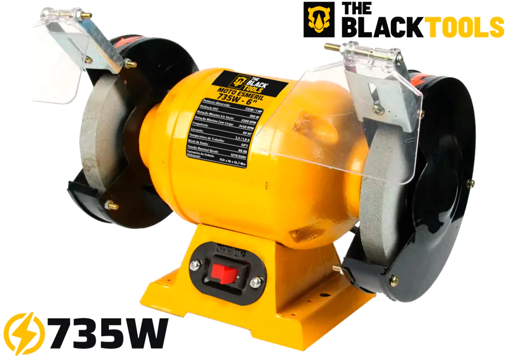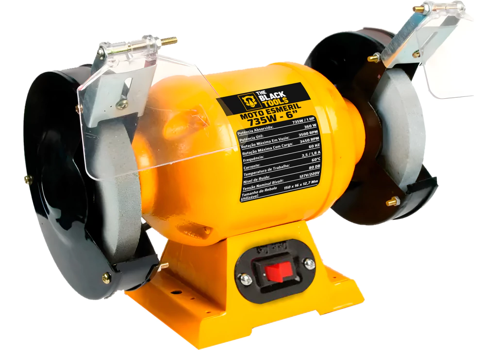 DESCRIÇÃO: O Moto Esmeril de 6" Polegadas Bivolt TME2000 traz o melhor custo-benefício da categoria, com motor potente de 735W e rotação de até 3450RPM. O Moto Esmeril The Black Tools também vem com dois rebolos de 6" cada para diversificar as aplicações. É equipado com acessórios de segurança, como: Protetor de Cavacos transparente e ajustável, que possibilita a visualização completa da peça durante a execução do trabalho. Esse é um produto recomendado para trabalhos de desbaste, polimento, afiação, etc., e sua aplicação se dá em diversas áreas como artesanatos, chaveiros, cutelarias, oficinas mecânicas, serralherias, marcenarias, entre outras.