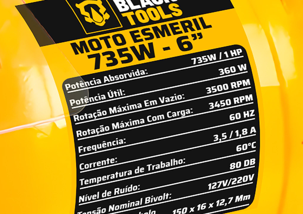 CONTEÚDO DA EMBALAGEM: - 01 Moto Esmeril 6" Polegadas Bivolt 735W 3450 RPM - The Black Tools