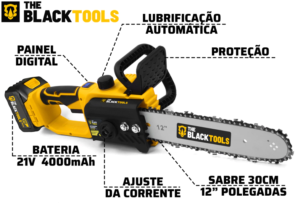 Descrição: A Motosserra a Bateria 21V 30CM da The Black Tools é uma ferramenta versátil e sem fio, ideal para trabalhos de carpintaria, jardinagem e podagem. Projetada para proporcionar praticidade e eficiência, é indicada tanto para serviços leves quanto pesados.