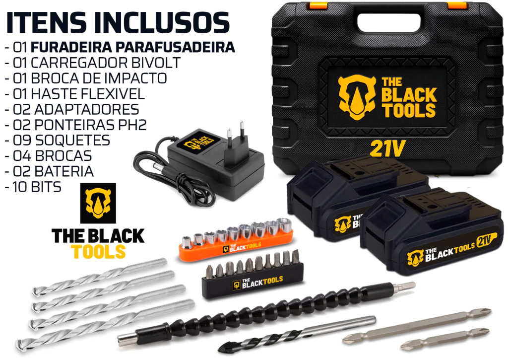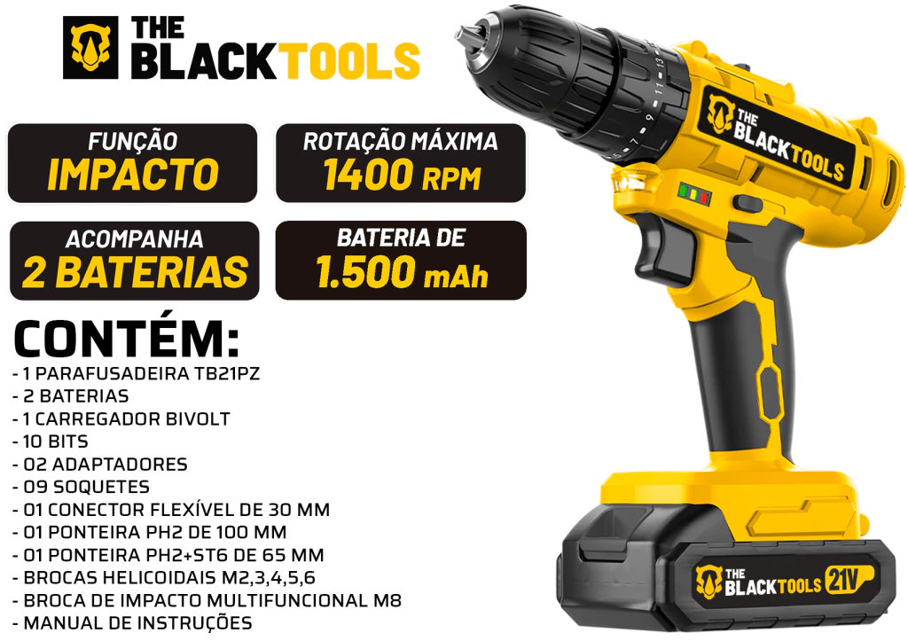 FURADEIRA PARAFUSADEIRA DE IMPACTO SEM FIO A BATERIA 21V 3/8 10MM COM MALETA E ACESSÓRIOS TB-21PZ - The Black Tools A furadeira The Black Tools TB-21PZ a bateria de 21V é uma ferramenta poderosa e versátil projetada para atender às necessidades de perfuração em diversos materiais. Com um design ergonômico e compacto, proporciona conforto durante o uso prolongado e facilita o manuseio em espaços restritos.