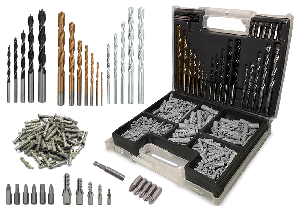 As Broca de concreto são feita de aço carbono com uma placa de metal duro feita de material VK8, brocas para metal de aço rápido (HSS), brocas para madeira são de aço-carbono. Bits de aço cromo vanádio, instrumentos embalados em caixa de plástico.
