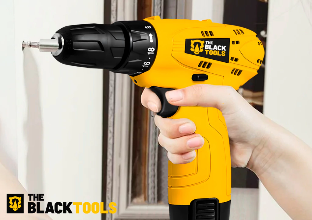 A Parafusadeira/Furadeira The Black Tools TB12A tem design ergonômico, mandril de 3/8" e luz de LED para iluminação, ideal para alcançar cantos menores e com pouca luz.