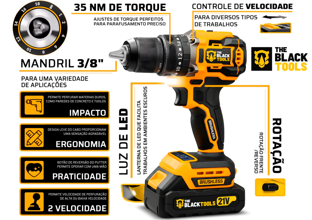 DESCRIÇÃO: A Parafusadeira e Furadeira de Impacto TB-21YX da The Black Tools é a ferramenta ideal para quem busca potência, versatilidade e mobilidade em um só equipamento. Com motor brushless (sem escovas), oferece maior eficiência, durabilidade e menor necessidade de manutenção. Equipada com duas baterias de 21V, permite longos períodos de uso contínuo e conta com três funções: furar, parafusar e furar com impacto. Compacta e robusta, é perfeita para profissionais da construção, marcenaria e manutenção em geral.