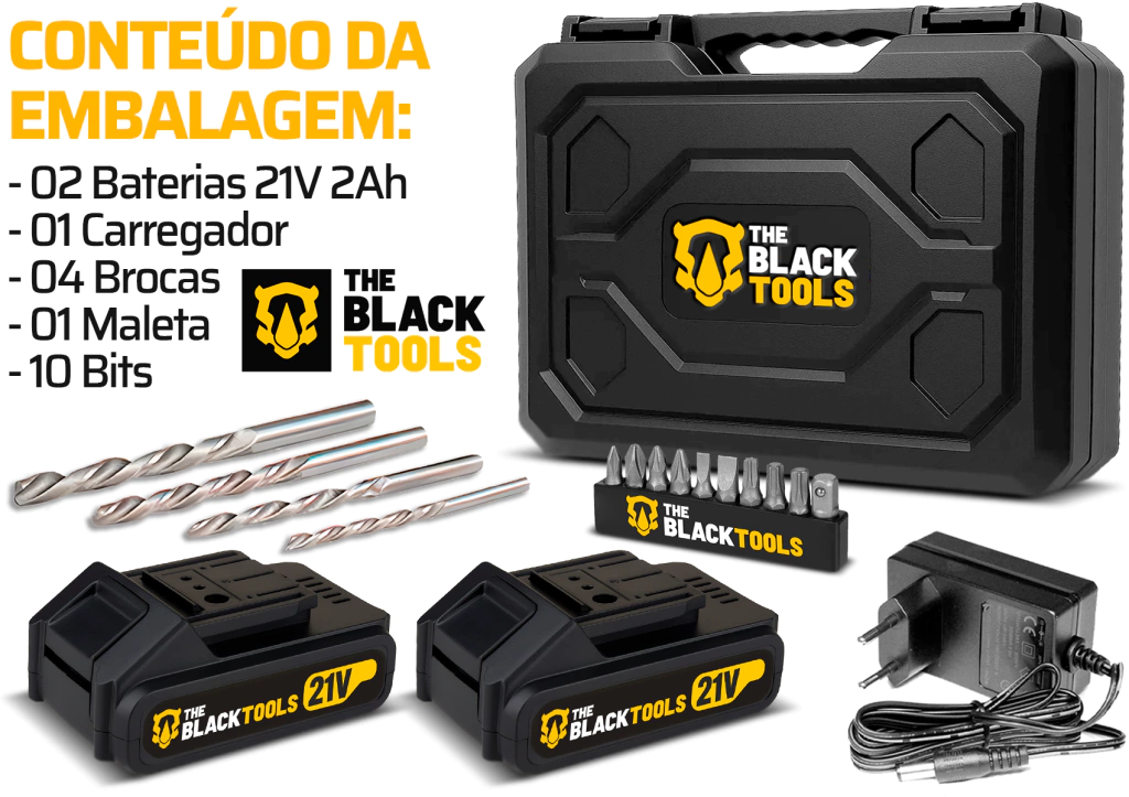 PARAFUSADEIRA FURADEIRA DE IMPACTO SEM FIO PROFISSIONAL 2 BATERIAS 21V COM MALETA BROCAS BITS TB-21YX - The Black Tools