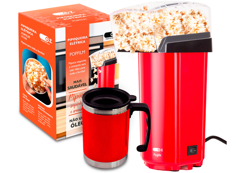 Ficha Técnica: - Marca: OZ - Modelo: PC9500 - Potência: 1500W Alta potência para um preparo rápido - Bocal Direcionador: Direciona a pipoca diretamente para a tigela - Botão Liga/Desliga: Preparo automático sem necessidade de acompanhamento - Proteção Contra Superaquecimento: Sistema de segurança que previne o aquecimento excessivo do aparelho + CANECA TERMICA 400ML VERMELHO