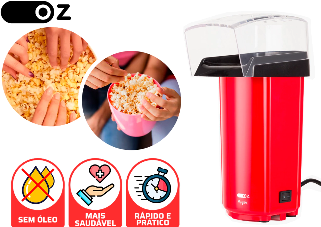 Curta seus filmes com uma pipoca saudável e saborosa, preparada em segundos! A Pipoqueira Elétrica OZ Gourmet torna tudo mais prático e saudável, pois dispensa o uso de óleo, garantindo uma pipoca leve e crocante. Com um design moderno e compacto, ela ocupa pouco espaço e ainda traz um visual atraente que combina perfeitamente com sua cozinha.