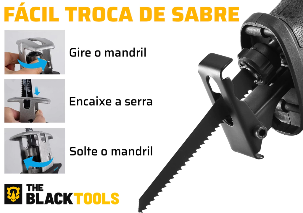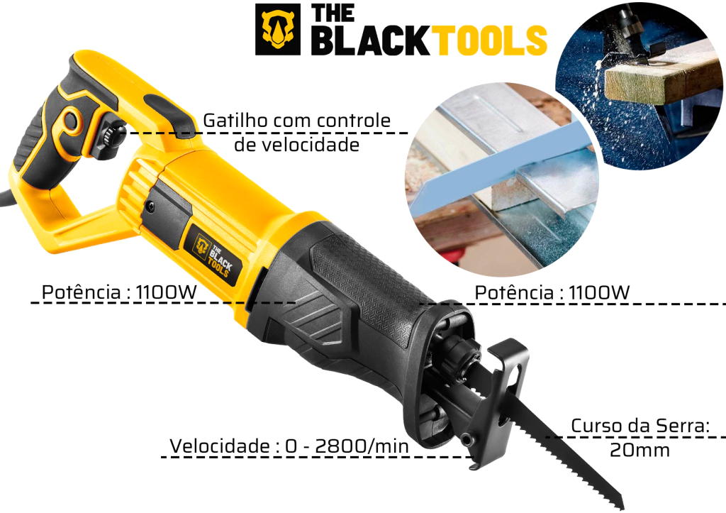 A Serra Sabre da The Black Tools TSS1100 é um produto ideal para trabalhos de construção, profissional ou doméstico; A serra sabre é utilizada para cortar materiais como madeira, metal e até mesmo tijolos, tornando-a indispensável em trabalhos de demolição, instalação de tubulações e construção em geral; É possível realizar cortes precisos em madeira, molduras e laminados.