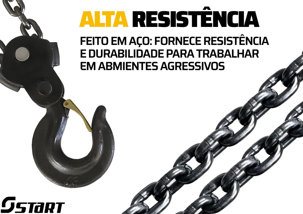 CONTEÚDO DA EMBALAGEM: - 01 Corrente de aço com 5 metros de elevação; - 01 Manual de instruções e segurança; - 01 Talha Manual START 2 Toneladas; - 01 Gancho de fixação reforçado.