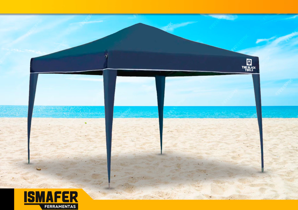 CARACTERÍSTICAS: - Composição: Aço com pintura eletrostática - Cobertura em tecido Oxford revestido - Revestimento interno em prata 210D - Proteção: UV30+ , 95%UVA, 99% UVB - Dimensões: Base 3x3m / Altura: 2,6m - Inclui espeques metálicos e cordas - Estrutura metálica articulada - Pés telescópios em alumínio - Cor: Azul
